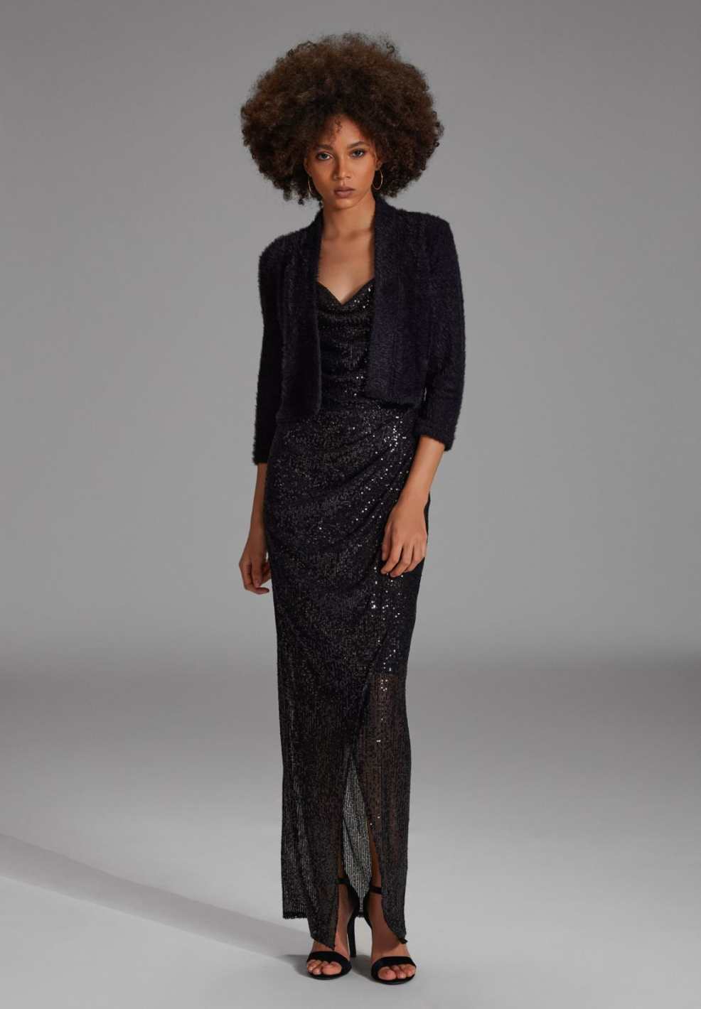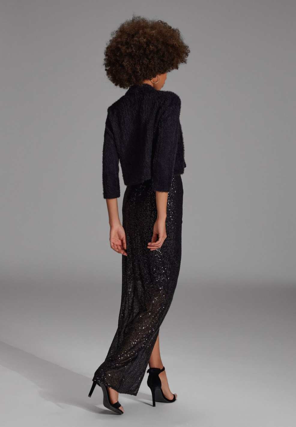 Ein Hauch von Luxus umgibt dieses schwarze Strickjäckchen mit seiner flauschigen Textur.