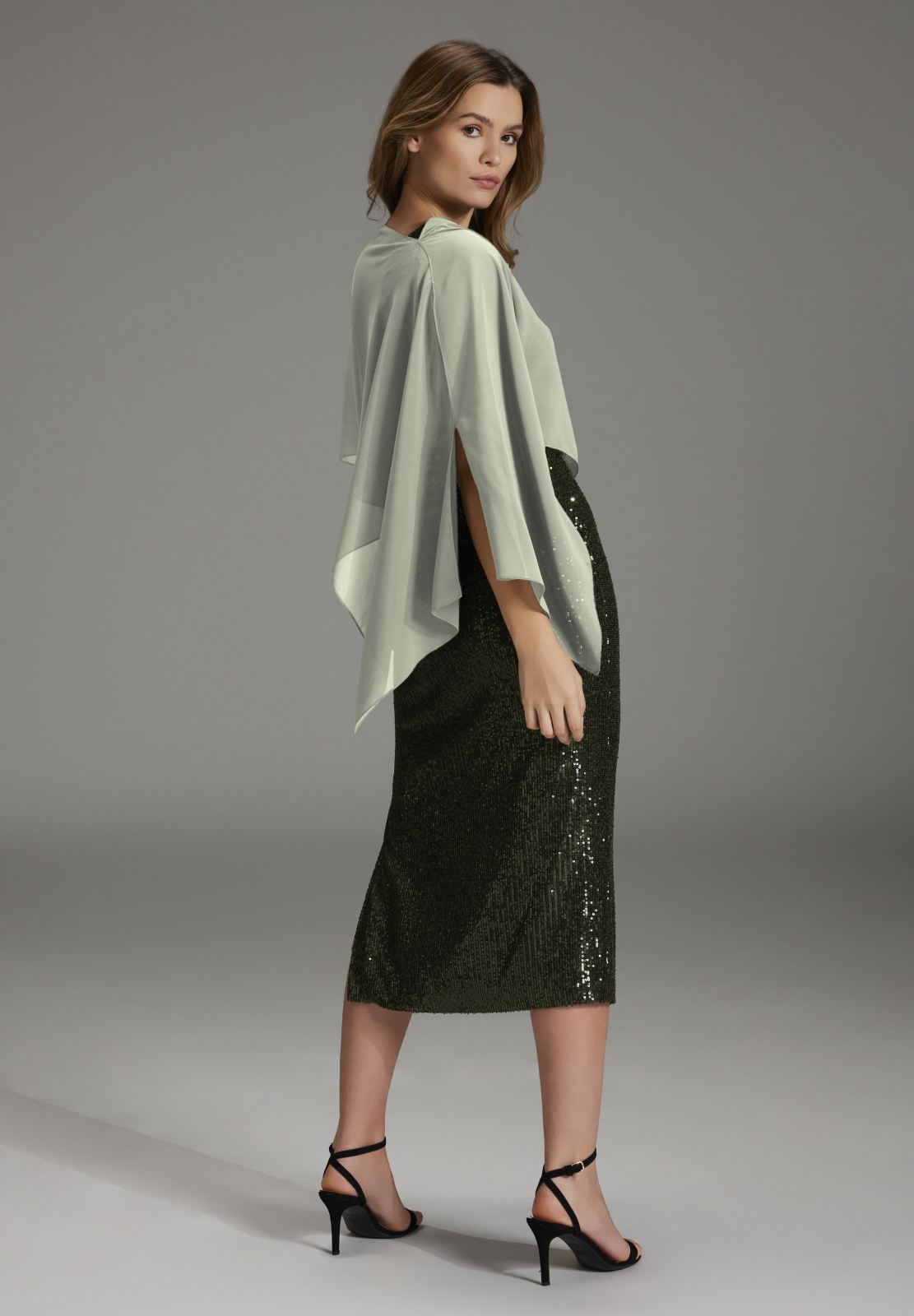 Diese semitransparente Stola verleiht jedem Outfit eine Aura von Geheimnis und Raffinesse. Das auffällige Detail sind die fließenden Chiffon-Ärmel, die in asymmetrischen Spitzen auslaufen