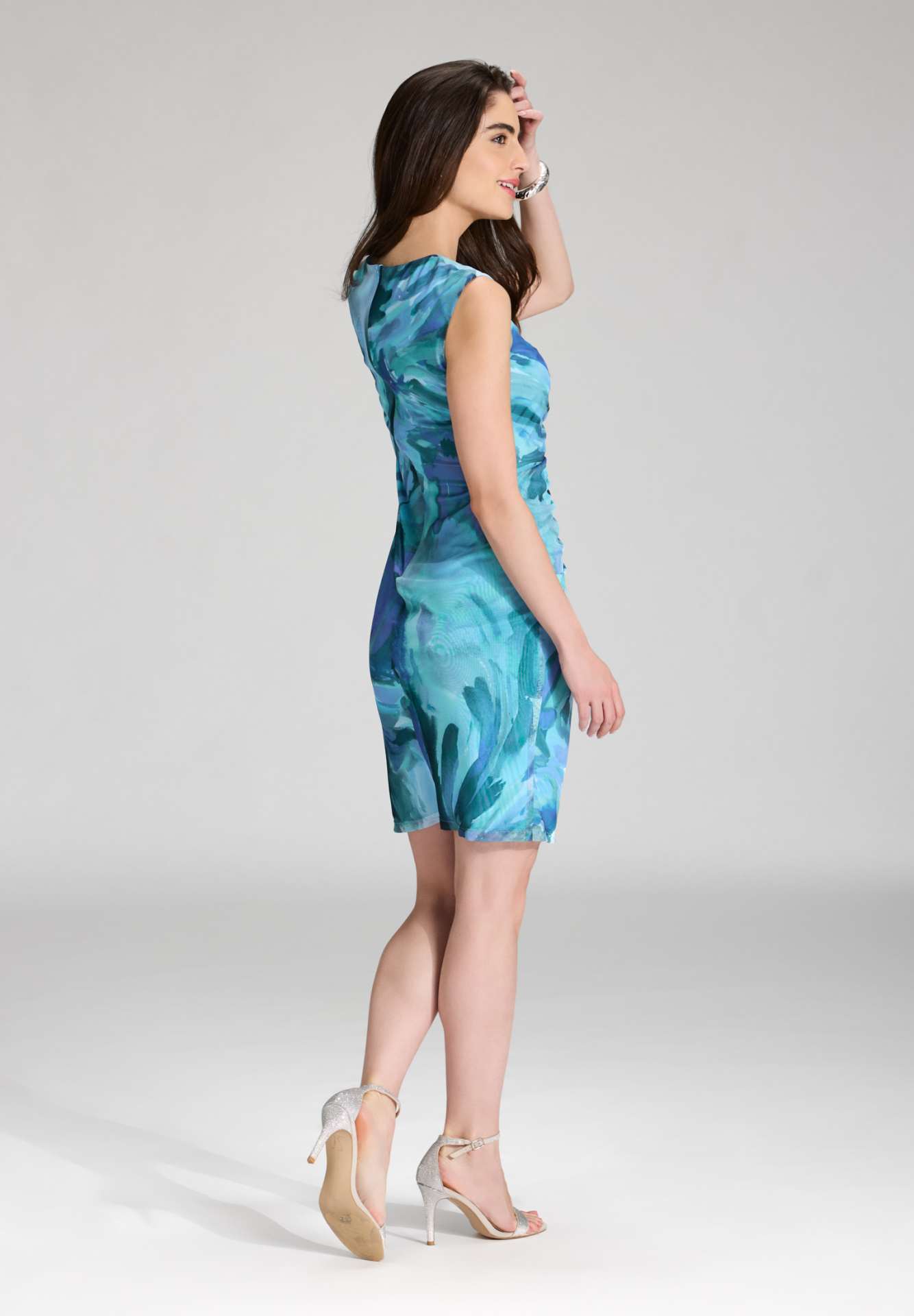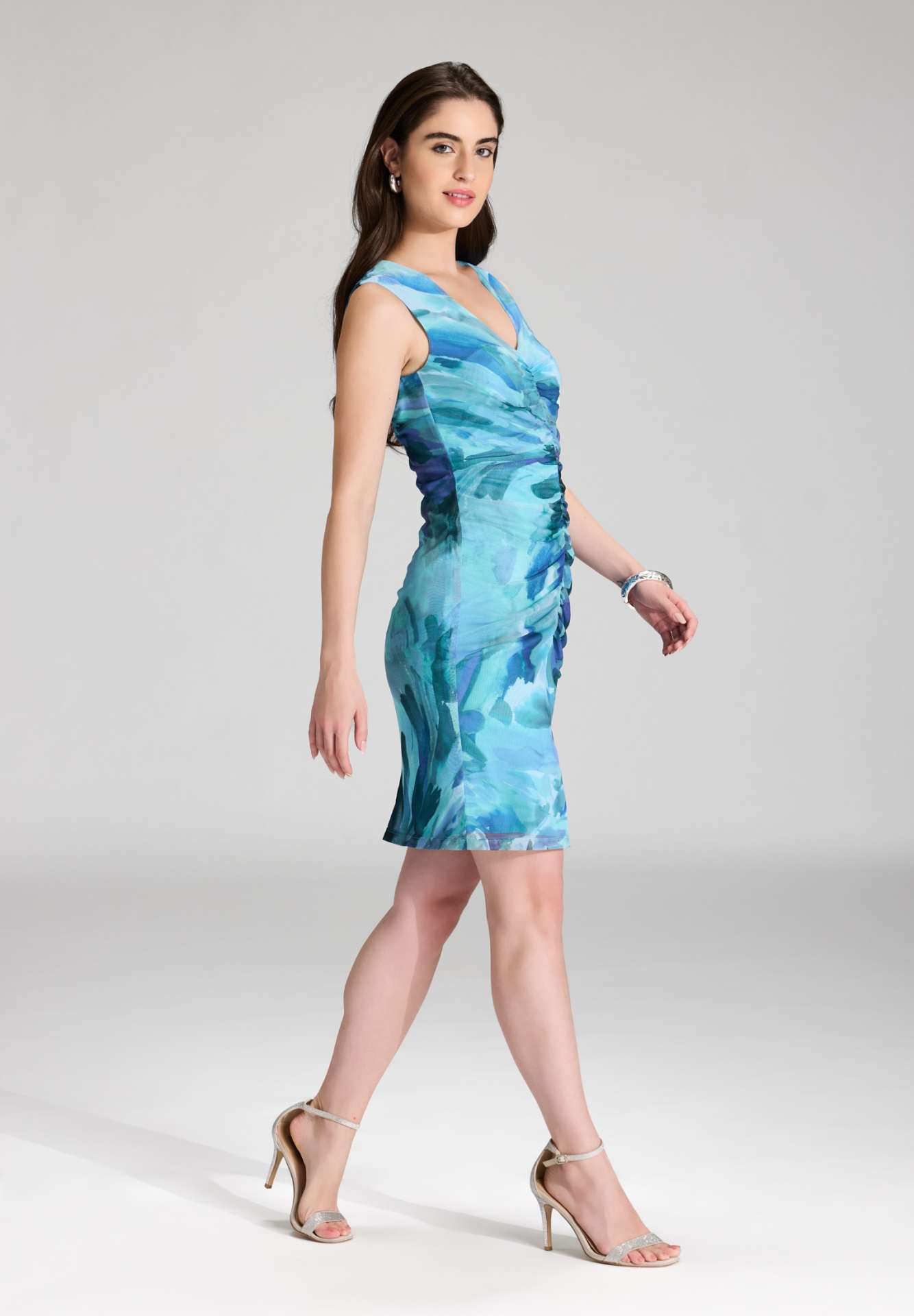 Etuikleid mit V-Ausschnitt und Raffung aus bedrucktem Mesh