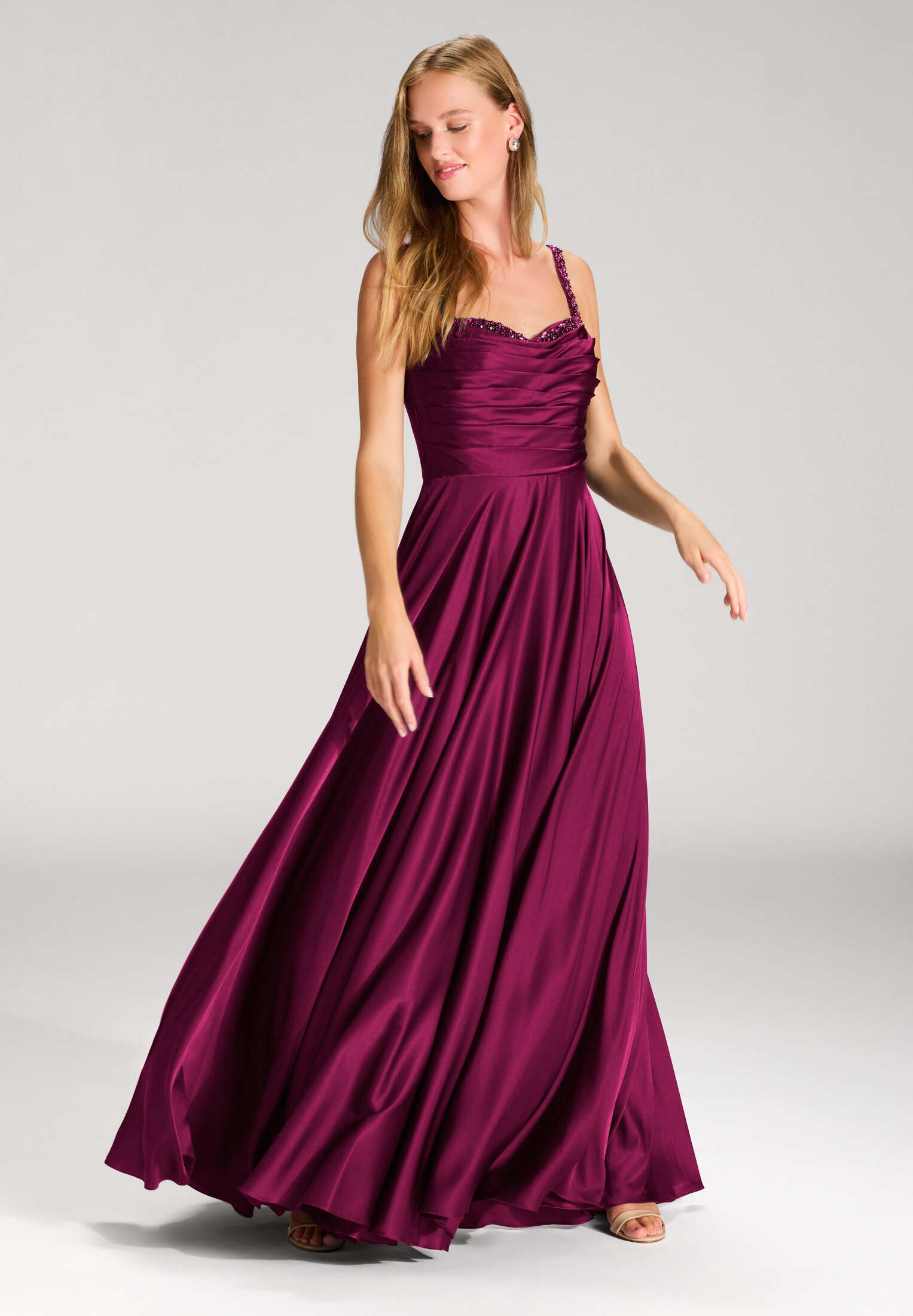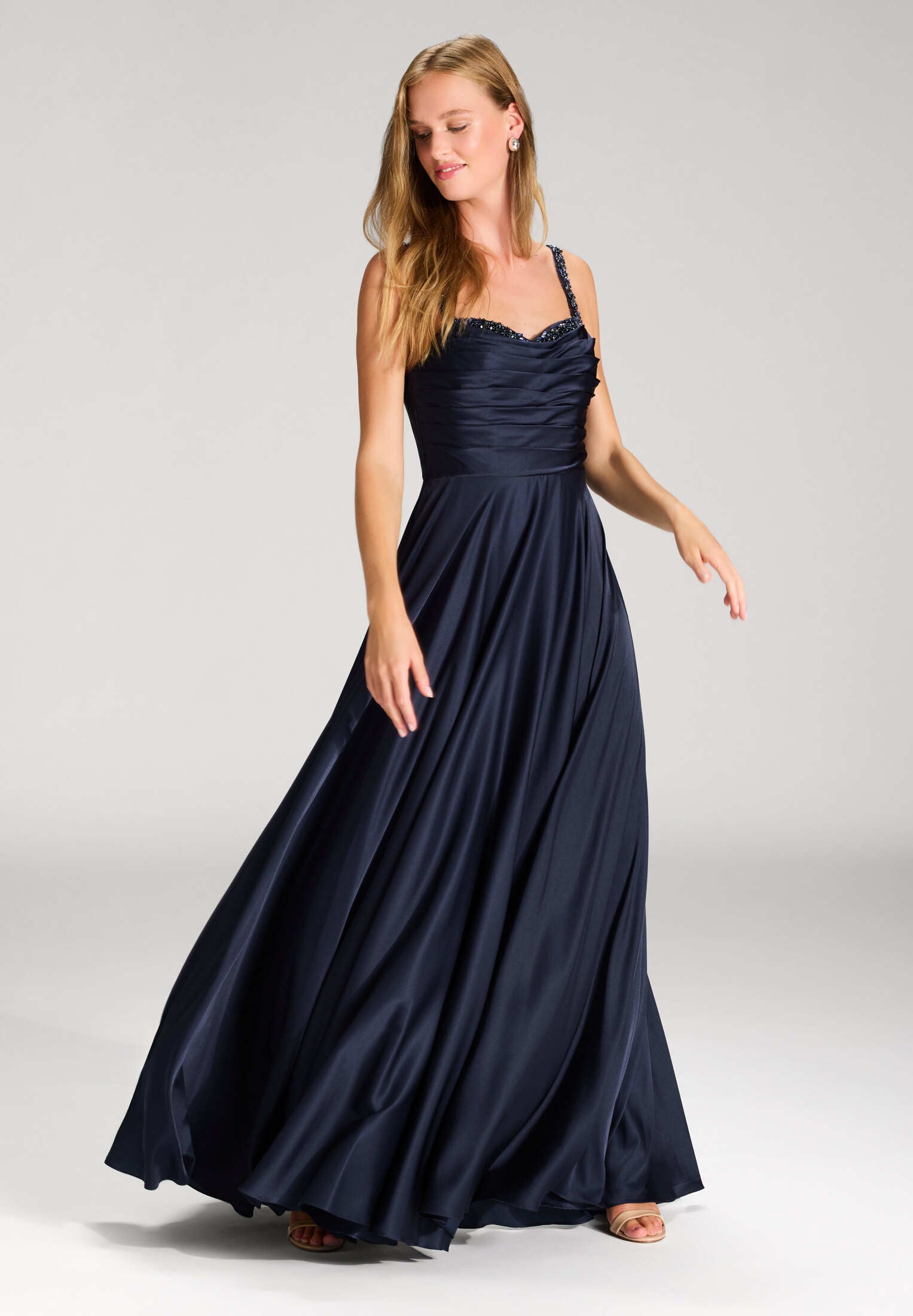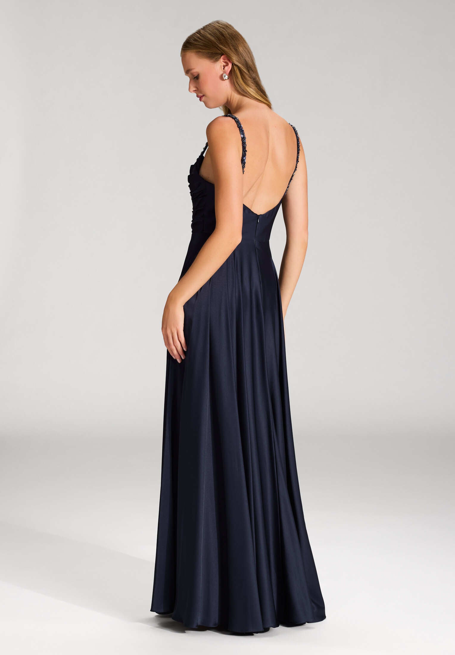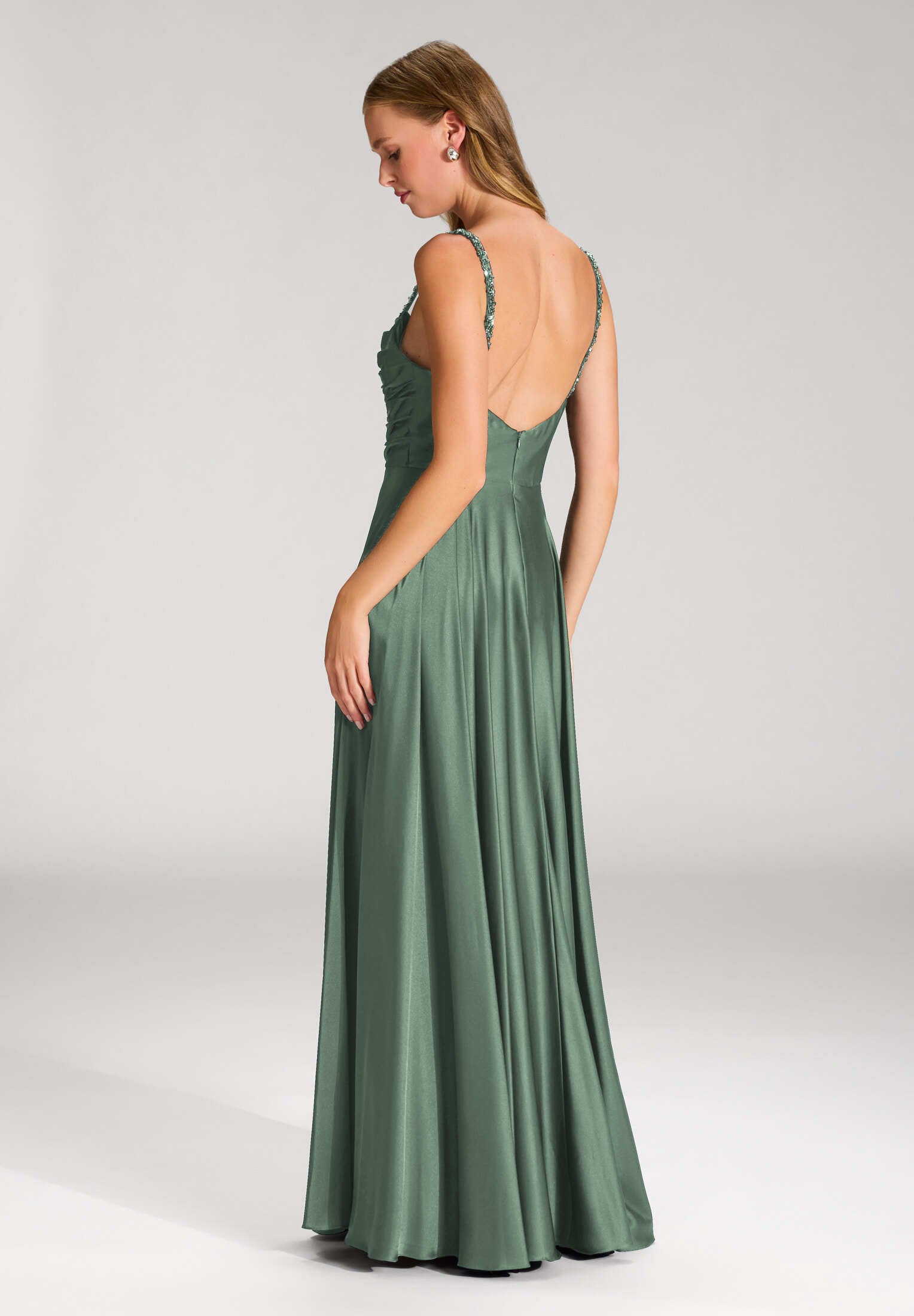 Satinkleid mit drapiertem Top und bestickten Trägern